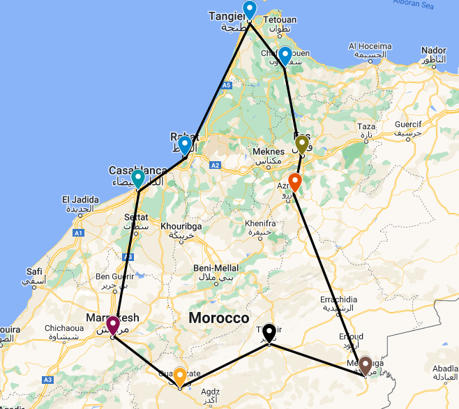 Embark on a captivating 10-day journey through Morocco with our expertly crafted grand tour, showcasing the country’s most iconic sights and experiences. Start your adventure in Marrakesh, exploring its bustling souks and serene gardens. Traverse the majestic High Atlas Mountains to Ouarzazate, then immerse yourself in the mesmerizing Sahara Desert at Merzouga, enjoying camel rides and nights at a luxurious desert camp. Next, head to Fes, with a stop at Ifrane, the picturesque "Switzerland of Morocco," and its nearby cedar forests. Discover Fes’s ancient wonders, then continue to the enchanting blue city of Chefchaouen. Wander through Chefchaouen’s charming streets, then travel to Tanger and Rabat to experience breathtaking coastal views and cultural richness, including the impressive Hassan Tower. Conclude your journey with a final day tour in Casablanca before returning to Marrakesh for your departure. This itinerary offers a comprehensive exploration of Morocco’s diverse landscapes, rich heritage, and vibrant culture.